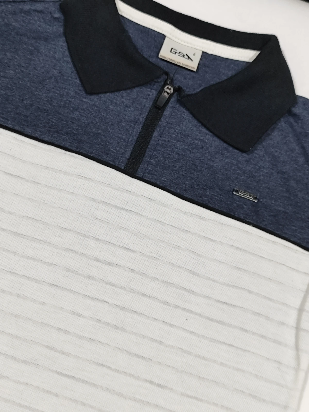 Polo color block com gola preta e zíper discreto, confeccionada em tecido macio e respirável; caimento reto e acabamento de qualidade garantem conforto o dia todo.
