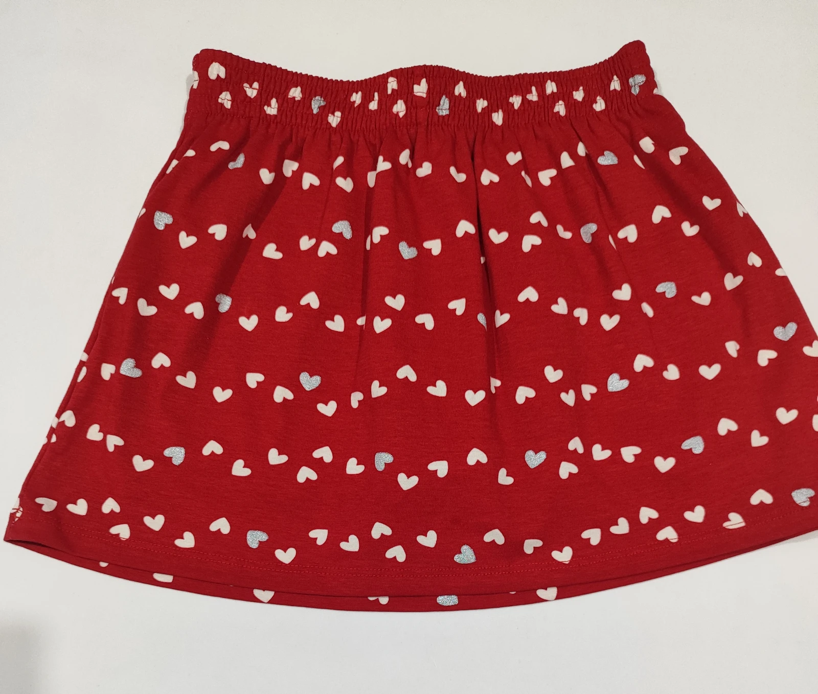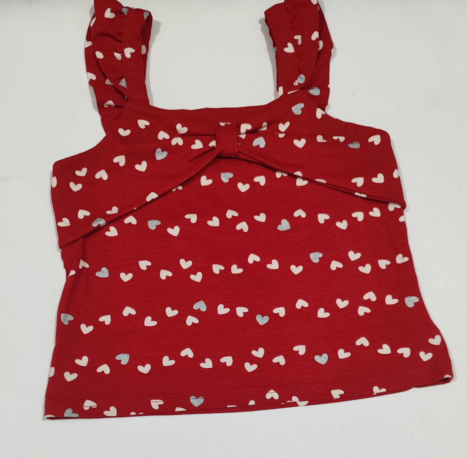 Conjunto infantil de duas peças em tecido macio e respirável, com estampa de corações brancos sobre fundo vermelho. Blusa sem mangas com alças largas e detalhe franzido na frente, combinando com saia de cintura elástica para ajuste perfeito na brincadeira. Ideal para o dia a dia, festas e passeios, oferecendo conforto o dia inteiro. Combine com sandálias ou tênis para um look fofo e moderno.