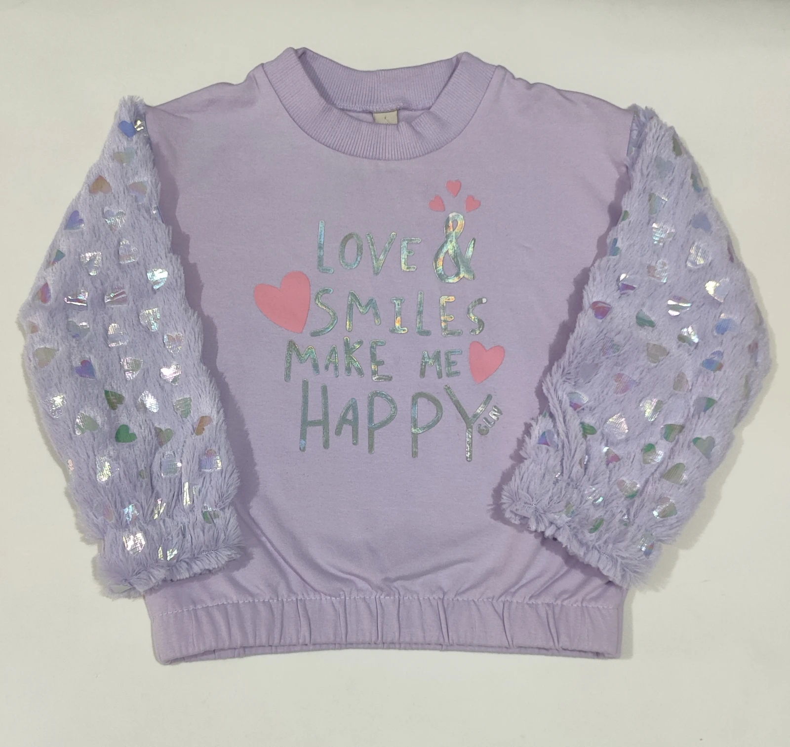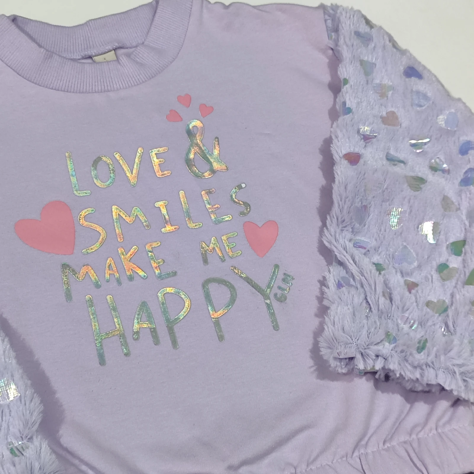Conjunto Moletom Lilás Infantil — maciez e conforto para o dia a dia. Blusa com estampa divertida Love & Smiles e manga com paetês holográficos no tule, conferindo brilho sutil. Calça jogging em tecido macio com barra elástica garante ajuste perfeito e liberdade de movimento.