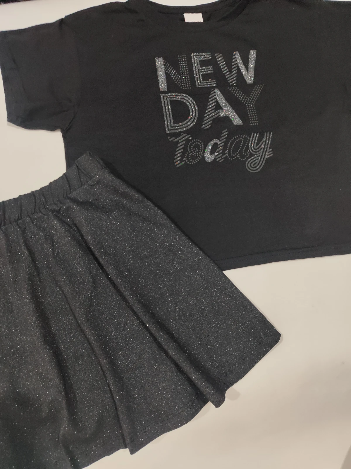 Conjunto infantil feminino com blusa de algodão macio e saia com brilho discreto. A blusa tem estampa moderna e gola redonda; a saia, com cós elástico, oferece caimento solto e conforto durante brincadeiras. Tecido resistente, costuras reforçadas e fácil de lavar, ideal para o dia a dia da criança. Perfeito para escola, passeio e diversão.