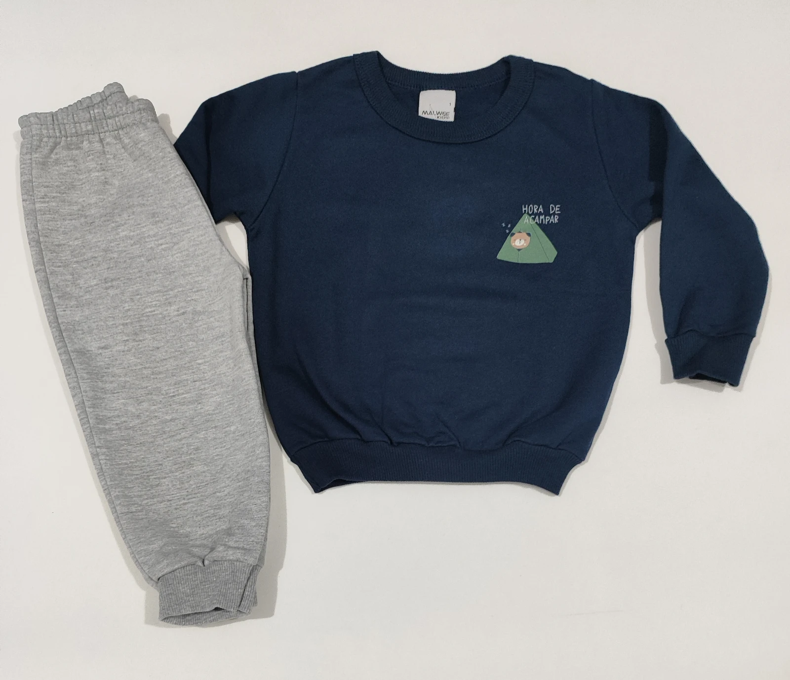Conjunto bebê moletom marinho: conforto macio para o dia a dia do bebê. Sweatshirt com toque suave, gola redonda e punhos elásticos, combinada a uma calça jogger cinza com cós elástico. Tecido macio, respirável e resistente, ideal para brincadeiras, sonecas e passeios. Ajuste seguro, fácil de cuidar e perfeito como presente para recém-nascidos e bebês em crescimento.