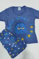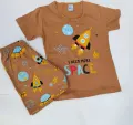 Conjunto de Pijama infantil 2 peças: camiseta de manga curta com estampa espacial e bermuda com foguete, planetas e estrelas.